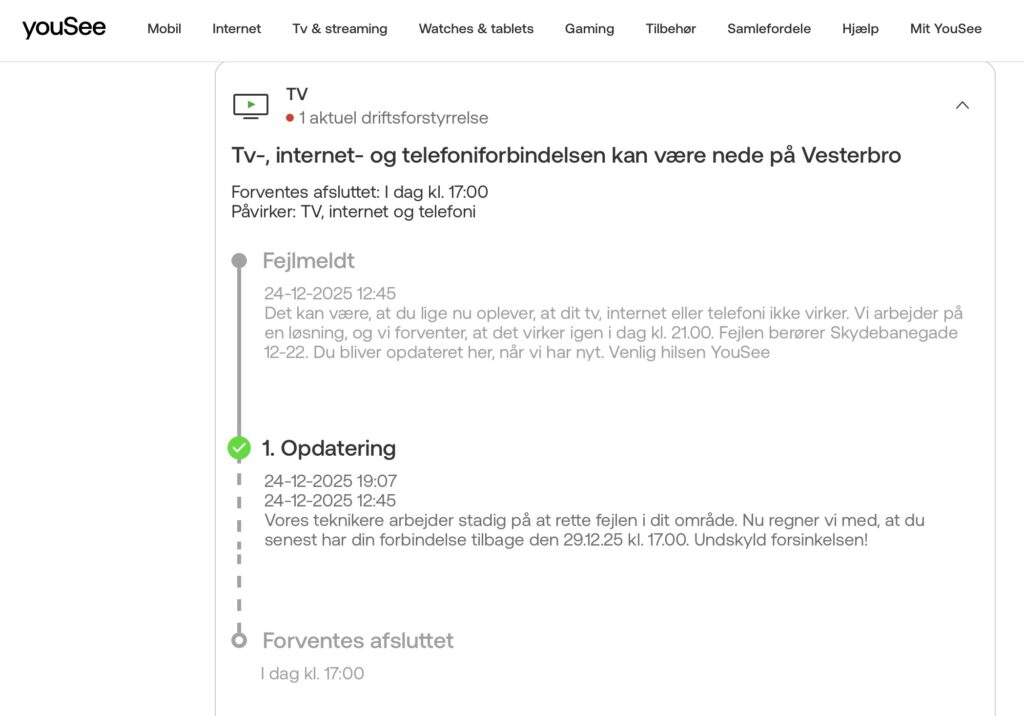 YouSee har tekniske problemer på en del af Vesterbro. Hos os påvirker det Skydebanegade 10-22. YouSee forventer at have udbedret fejlen den 29. december klokken 17.